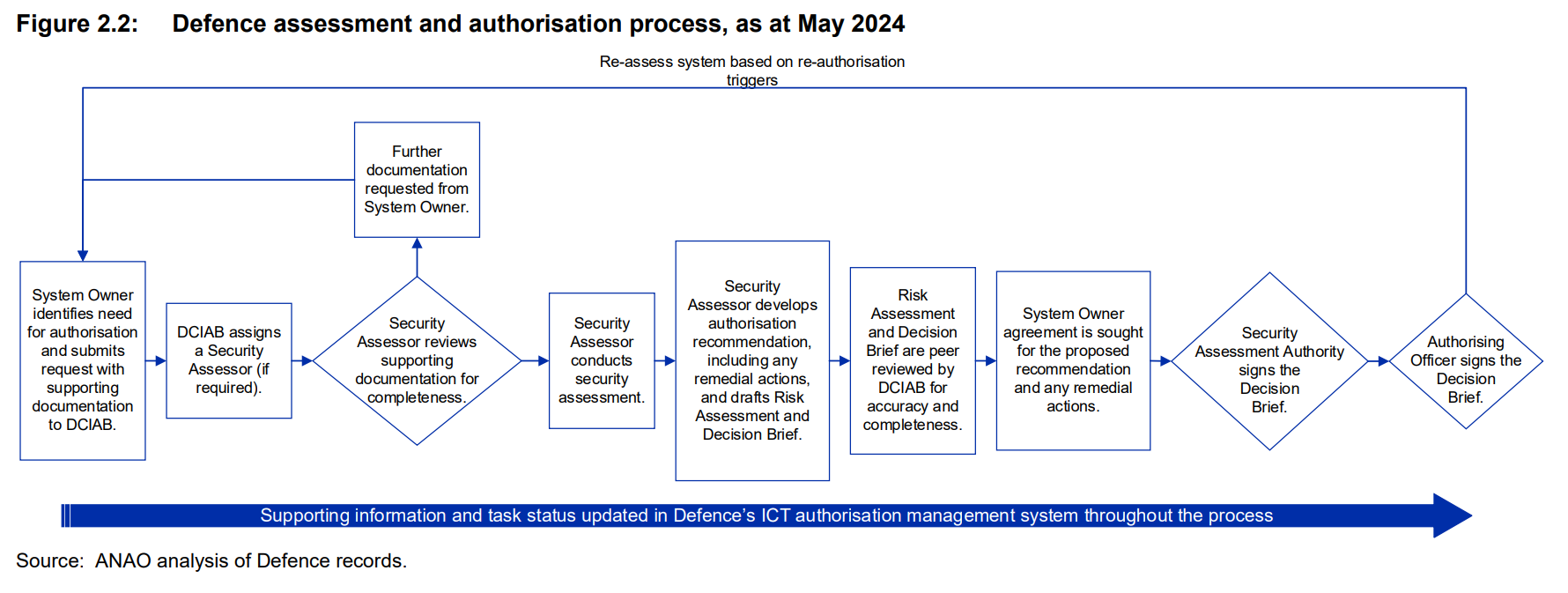 Defence has established the Defence Security Principles Framework (DSPF) to support compliance with the requirements of the PSPF. DSPF Principle 23, which is supported by Control 23.1 ICT Certification and Accreditation, outlines Defence’s requirements for ICT assessment and authorisation including that: