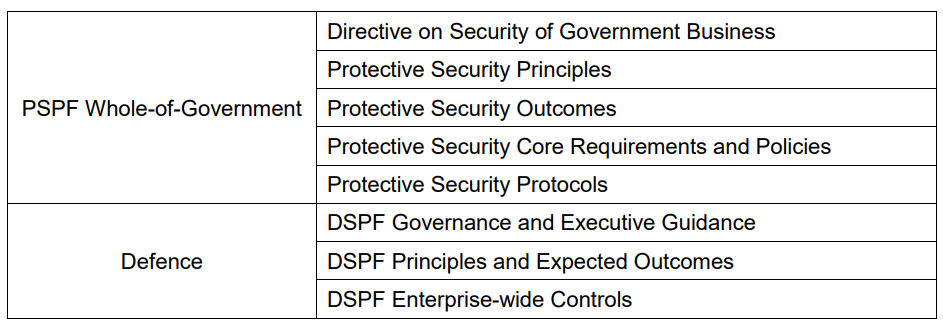 The DSPF aligns Defence with the Commonwealth’s Protective Security Policy Framework (PSPF). Under the PSPF, all agencies must develop their own protective security policies and procedures.