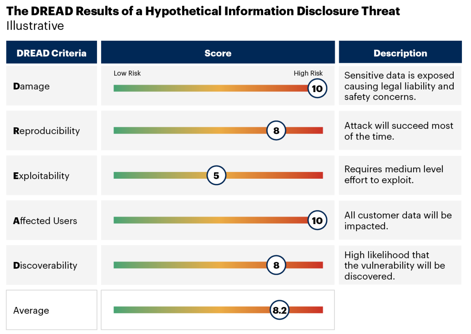 Each of these criteria can be scored with a rating from 1 to 10, with the average across all being the overall score for the threat. Figure 3 illustrates the DREAD rating and overall score of a hypothetical information disclosure threat.